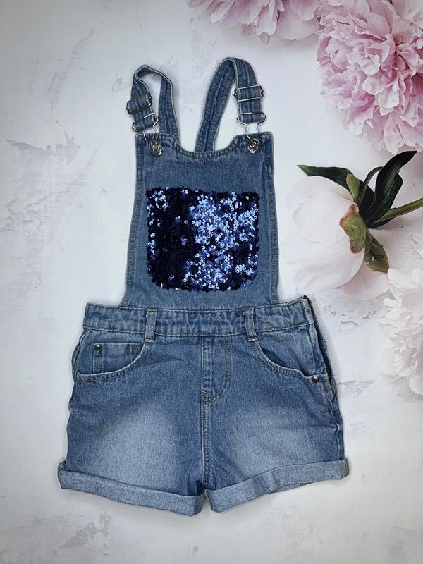 Джинсовый комбинезон с карманом из пайеток Сбоку застёжка для удобства надевания Регулируемые лямки Состояние идеальное без дефектов 🏷George 8-9 лет Длина 60. Длина шорт 25. ПОТ 31