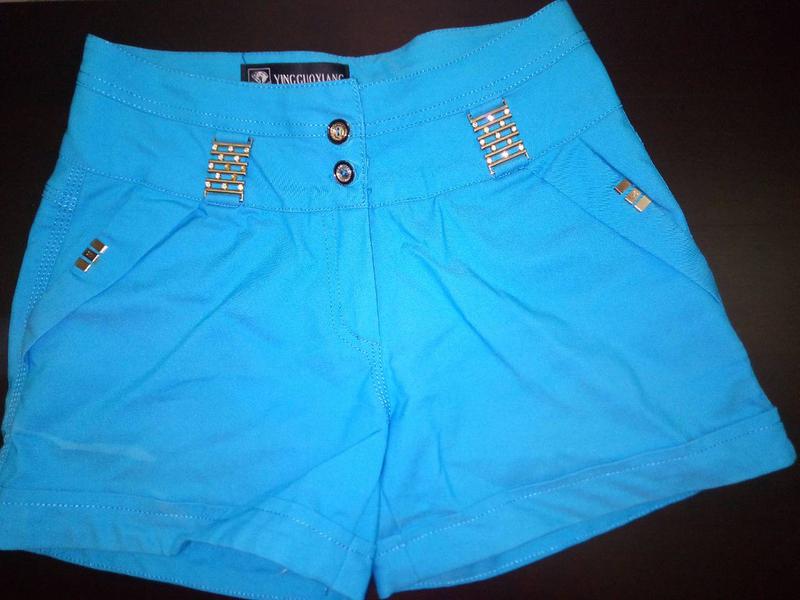 Шорты для девочки подростка недорого купить в Киеве. Нарядные, легкие шорты украшены кармашками и блестящими пуговками. Шорты подойдут на возраст 10-12 лет. Цвет бирюза. ПОТ =29см, ПОБ = 40см, длина 30см. Доставка Новой почтой по Украине, самовывоз Киев