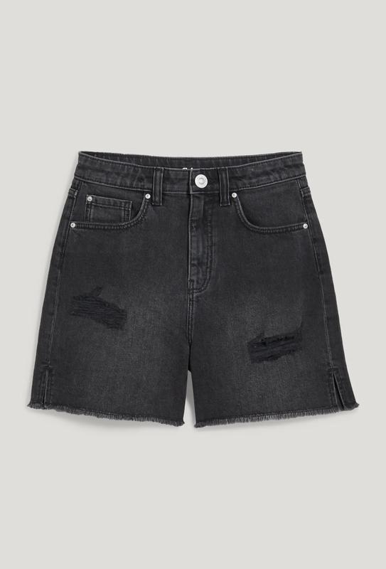 Джинсовые шорты-бермуды из эластичного денима с выстиранным и потертым эффектом. Потертый край с короткими боковыми разрезами.
