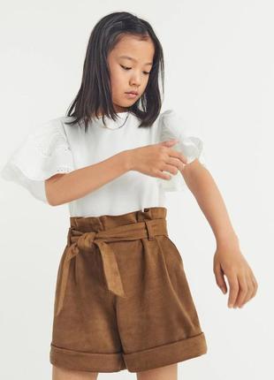 Шорты замшевые фирмы Zara Размер указан 6 лет, на рост 116 см Состав ткани: 91% полиэстер, 9% эластан Замеры: ПолуОбхват в поясе - 27 см (на спинке резинка, мах тянется до 36*2см); Полуобхват в бедрах - 36-38 см; ПолуОбхват в самом широком месте - 44 см; Длина по боковому шву - 28 см; Длина по внутреннему шву - 10 см; Ширина галоши сверху\снизу - 26/26 си Расстояние от пояса до шва спереди / сзади - 23/28 см. Состояние новое, с этикеткой