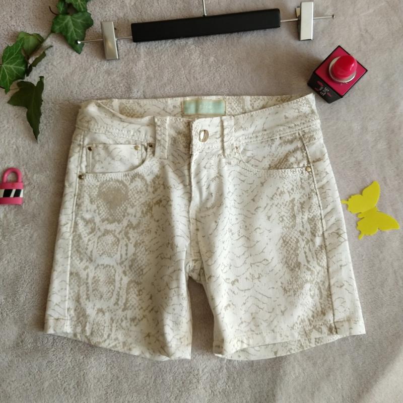 очень красивые шорты визуально 13 лет пояс в положении как на фото 31 до 40 в бёдрах в спокойном состоянии 43 легко тяну до 55 боковой шов 29 состояние Идеальное этикетка размера срезана , только есть бренд