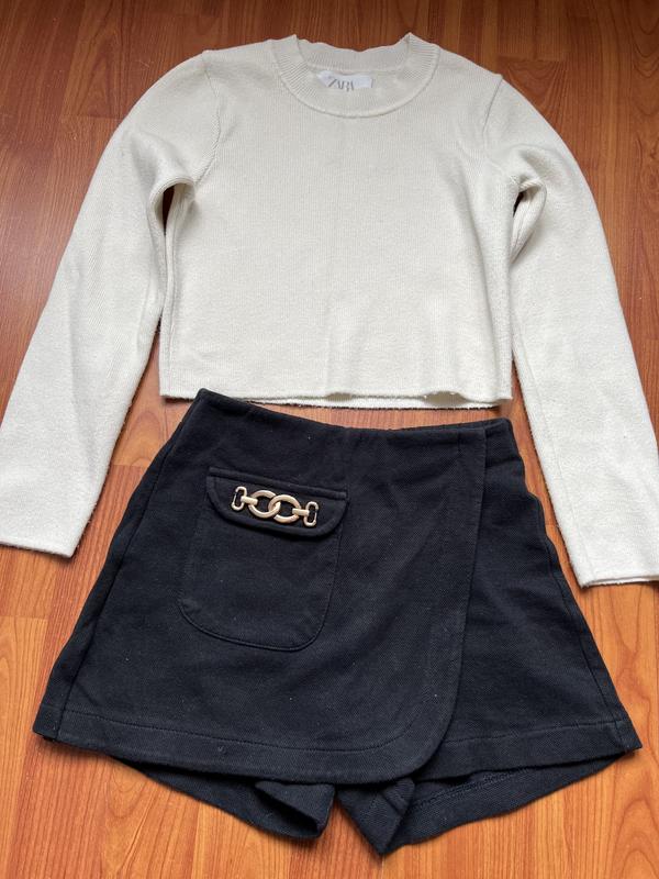 Продам костюмчик Zara, укороченная кофточка молочного цвета в отличном состоянии. Юбка-шорты синего цвета с цепочкой. Размер 134.