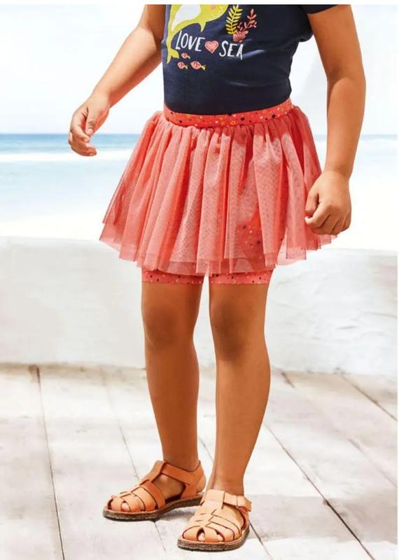 В наявності спідниця-шорти для дівчинки від німецького бренда lupilu, торговий дім Lidl. Матеріал: шорти: 95% бавовна, 5% еластан, спидниця: 100% поліестер. Розміри: 98/104 (2-4 років): довжина шортиків 24-25 см, ширина по поясу 24 см