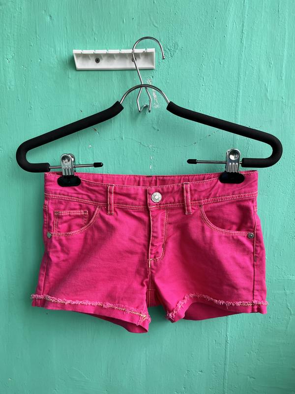 Присутні потертості в місцях, які не впливають на зовнішній вигляд, — усередині на поясі та на згині штанин (показано на останньому фото). Бірка з розміром відсутня, орієнтуйтеся на виміри: напівокружність поясу — 34 см (є утяжка), стегон — 41 см, довжина — 23 см, посадка спереду — 17, ширина штанини — 24. Підійде також на дорослий XXS-XS.