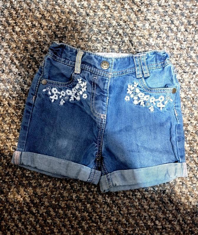 Такие нежные шорики с цветочной вышивкой. Есть утяжка. 1-1,5 года,80-86 см., соответственно бирки. Замеры: длина 24.5 см., ширина в талии 22 см., в бедрах 28 см.,шаговый 7 см.