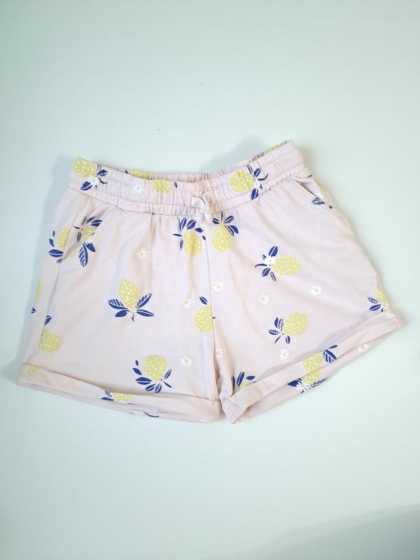 Шорты для девочки розового цвета с рисунками в хорошем состоянии. Состав хлопок. Замеры длина 24, посадка 25, пояс 26, бедра 40. Пояс на резинке со шнурком. Есть недостаток маленький желтый пятнишко.