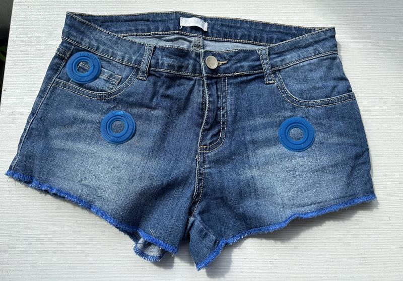 Джинсові шортики для дівчинки-підлітки відомого італійського бренду Fun&Fun Півобхват пояса - 37,5 см Півобхват стегон - 43 см Довжина штанки по боковому шву - 22 см Є гумки на поясі для регулювання ширини Склад: 98% - cotton, 2% - spandex