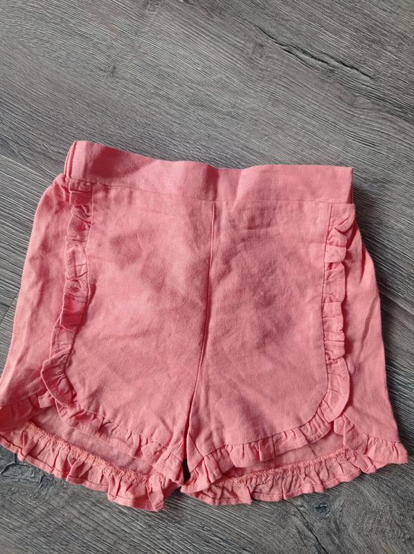 Красивые шортики на девочку персикового цвета. Сзади в поясе резинка.Спереди и на штанинах красивые рюши. Состав:50% лён,50% вискоза. Состояние новое, есть бирка. На 24-36 мес.Рост 98 см. Замеры:ПОТ-23 см(резинка);ПОБ-28,5 см; длина спереди-23 см,сзади-26,5 см. Фото на ребенке нет. Пересылка.