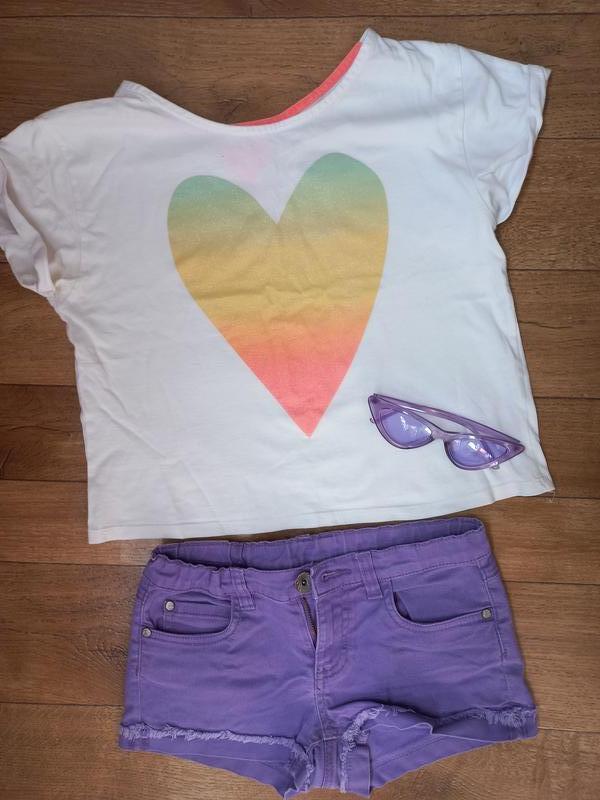 Шорты фиолетовые ширина- 32,5, длина- 24,5. Есть утяжка. Состояние отличное. По бірці 146.