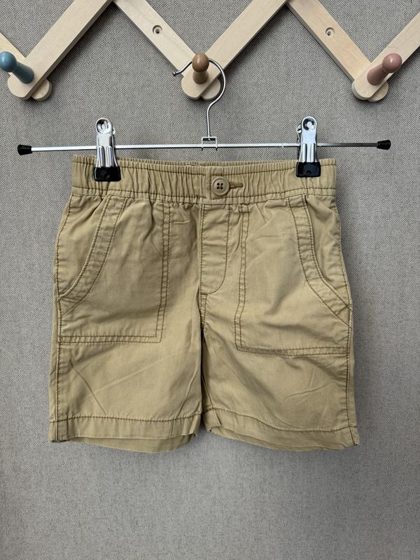 Легкие детские шорты песочного цвета. Имеют карманы впереди и сзади. На резинке - застежки не имеют, пуговица имитированная. По поясу есть резинки, чтобы регулировать ширину
