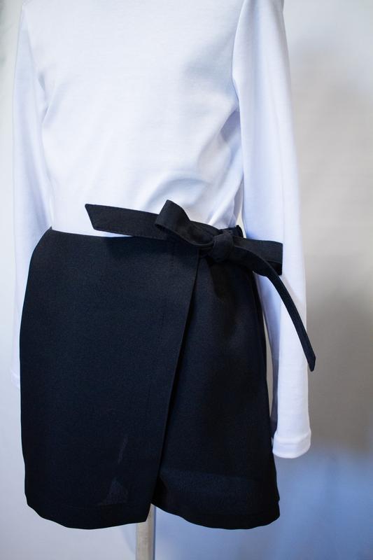 Шорти прямого силуету. На передней половинке отлетная асимметричная деталь, имитирующая юбку. По переду пояс, завязывающийся на бант. На задней половинке вставлена резинка. Доступные размеры от 122 - 158. В наличии 134 г. Ткань габардин, может быть цвет черный, серый, синий или свинец.