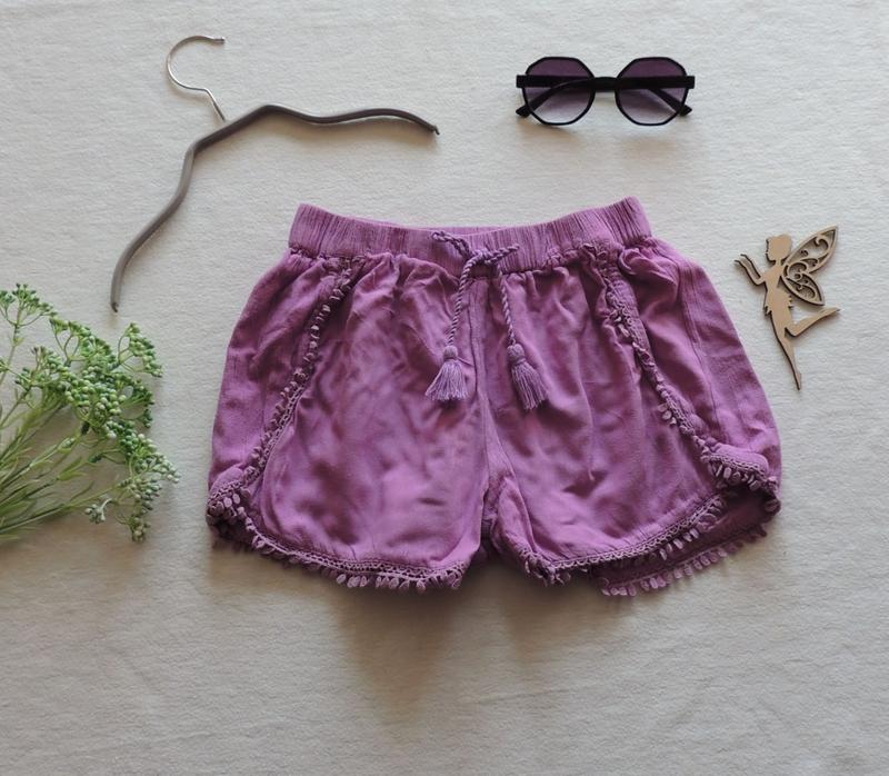 шорты сиреневого цвета бренд Next 8 лет верхняя часть вискоза нижняя часть хлопка качества в красивом состоянии в поясе резинка от 27 бедрах в спокойном состоянии от края до края 44 см могу потянуть до 51 длина по боковому шву минимальная 24 посередине Тришки больше ближе к 27