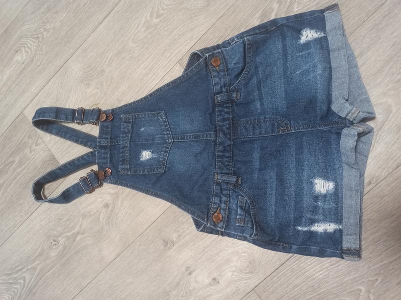 Джинсовый комбинезон шорты,карманы спереди и сзади. Длина шорты 23, талия 33.
