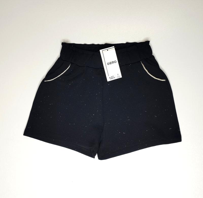 Gemo Шорты в позмере 122/128 черного цвета сверкают серебром пояс на резинке по бокам кармана