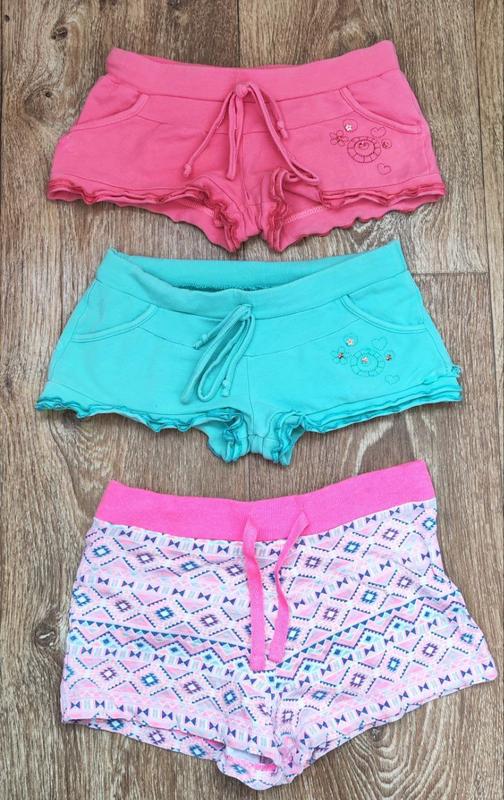 Продажа только набором, цена указана за 3 шт. Коралловые Valeri р.104, 95% хлопок и 5% лайкра. Состояние хорошее, пояс - резинка. Длина 14 см, шаг 3,5 см, полуобхват в поясе 27-33 см (тянется). Зеленые Valeri р.104, 95% хлопок и 5% лайкра. Состояние хорошее, в одном месте нужно подшит по шву, пояс - резинка. Длина 14 см, шаг 3,5 см, полуобхват в поясе 27-33 см (тянется). Цветные Young Dimensiоn р.104, 100% хлопок, состояние хорошее, есть незначительные потертости. Длина 18,5 см, шаг 4 см, полуобхват в поясе 29-35 см (тянется). Пересылаю.