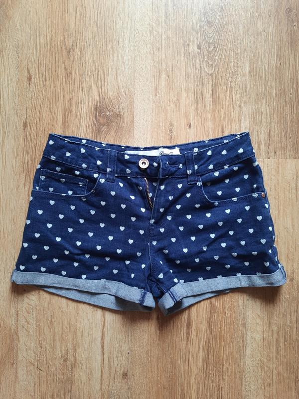 Джинсовые шорты для девочки, принт сердечко, на 10-11 лет, рост 146 см. Есть резинка с пуговицами для затяжки на поясе. Стан - идеальный, дефектов нет. Бренд - denim co. Производство - Бангладеш. Состав: 64% коттон, 24% полиэстер, 13% вискоза, 1% эластан.