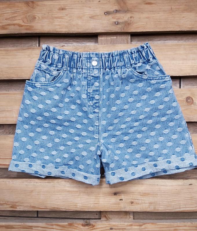 состояние идеально стильные шорты в горох длина 34 пояс резинка 31 см бедра 47 см джинс плотный, не тянутся.