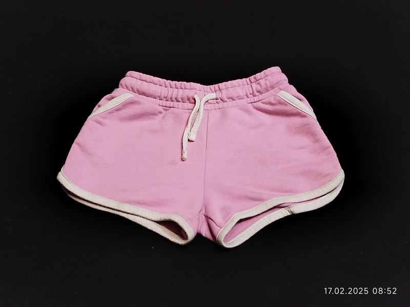 Минимальный заказ у продавца на 100 грн. Классные шортики розового цвета на ребёнка 2-3 года в очень хорошем состоянии, есть малозаметное пятнышко. Полуобхват по поясу регулируется резинкой и шнурком и тянется от 22 см до 32 см, длина по внутреннему шву штанины 5 см, длина по внешнему шву штанины 19 см, высота посадки 18 см. Ткань тянется. Модель 6008
