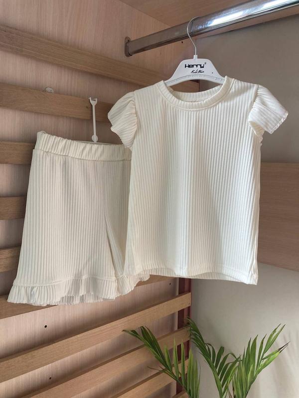 Комплект с шортиками и футболочкой. Очень удобный и легкий. Тканина рубчик мустанг гарно тягнеться, резиночка на шортиках не передавлює. Размеры:104см,110см
