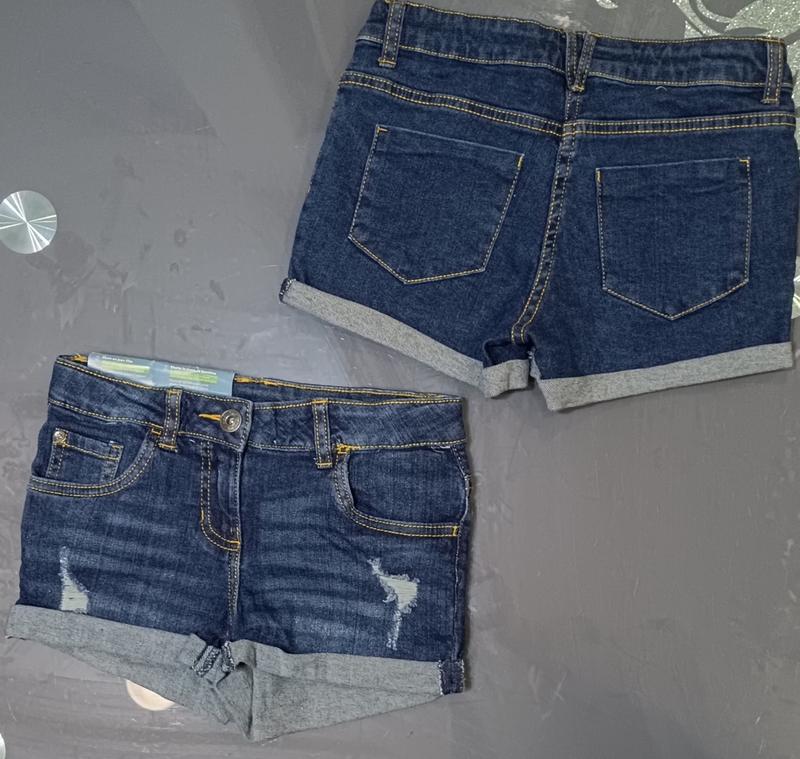 Новые джинсовые шорты для девочки немецкого бренда Pepperts Синие р.134 (8-9 лет): д.25 см, шаг 6 см, к промежности 24 см, пояс 30-31 см. р.152: д.28 см, крок 6 см, до промежини 24-25 см, пояс 33 см Голубые р.140: д.25-26 см, шаг 5 см, до промежности 23 см, пояс 30 см В поясе есть утяжка. Трендовый цвет и фасон (порванные) Цена за 1 шт.