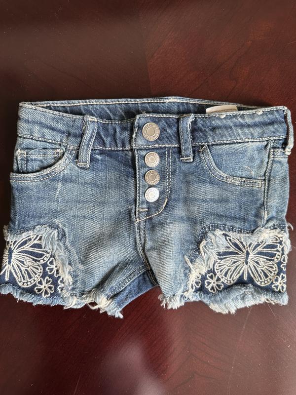 Джинсові шорти з додаванням еластану- тягнуться, декоровані вишивкою. Застібка на кнопках, є утяжки на поясі.