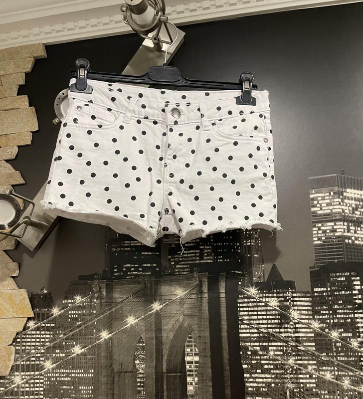 Джинсові дитячі шорти для дівчинки підлітка бренду Y.F.K.білого кольору в чорний горох,розмір 158 на 12-13 років,склад:98%котон,2%еластан,заміри:ПОТ 38 см в неростягнутому виді,тягнеться до 40 см,ПОБ 43 см,посадка 27 см,довжина по зовнішньому шву 26 см.