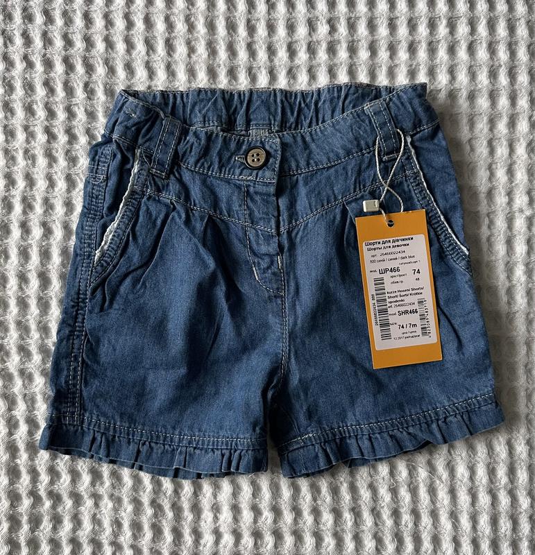 Дитячі шорти для дівчаток. Темно синього кольору з білим принтом на кишенях. Розмір 74. Стан - новий. При потребі скину додаткові фото/відео. Повернення немає.