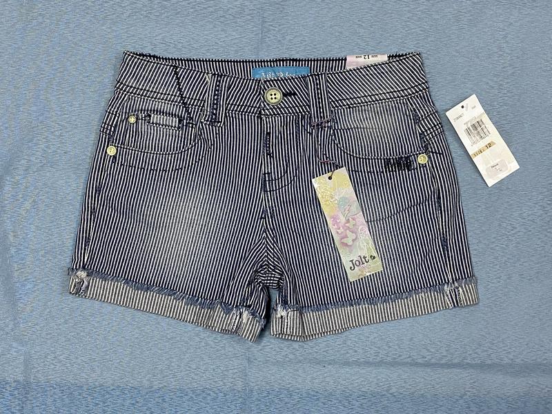 Шорти підліткові для дівчаток американського бренду Jolt jeans , виконані в синьому та білому кольорі в смужку , виробництво Китай , матеріал ( тонкий, стрейчевий ) :: 98% бавовна , 2% спандекс ! Шорти стрейчеві з середньою посадкою ! Розміри: 12 : ширина в талії - 32 см, ширина в стегнах - 41 см, довжина - 27 см , посадка ( перед ) - 20 см , ширина штанини ( низ ) - 23 см .