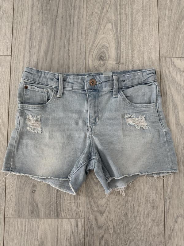 Джинсові шорти ніжно голубого кольору. Є невеличкі рваності. Класно виглядають на тілі. Стан нових. В поясі є утяжка. Розмір вказаний 9-10 р, ріст 140, але ми спокійно одягали при 152. Бедра півобхват 39-39,5 см, пояс півобхат 32,5 см, довжина збоку 25,5 см