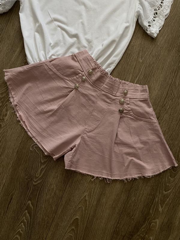 Стильні дитячі шорти з високою посадкою і кроєм, ніби спідниця. Є кишені. Фурнітура якісна. Пояс на резинці позаду. Тканина натуральна і тягнеться. Заміри: Пояс 31 Довжина 32