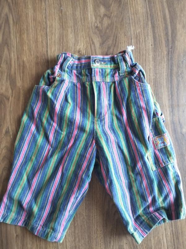Детские бу джинсовые бриджи на девочку:талия на резинке-17/34 см, разтянутая резинка-25/50 см, посадка-23 см, длинна-39 см, более внутрений шов-21 см