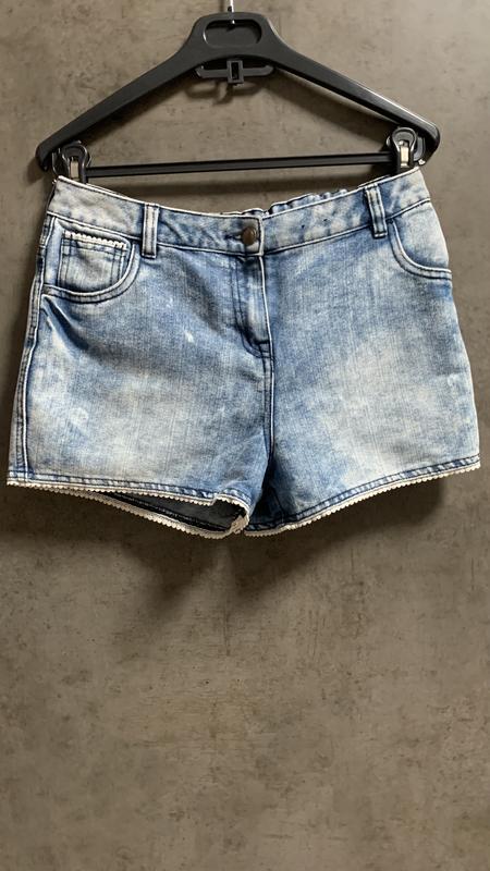 Короткі блакитно сині шорти з обробкою понизу. Розмір підлітковий. Носили як XS/S В поясі на регулювальній резинці ( в районі спини) По поясу 37 см По стегнах 53 см Довжина 30 м Стан відмінний, без дефектів.