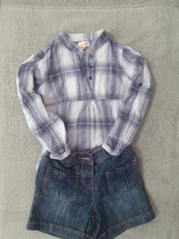 Рубашка на девочку указана 116 рост,фиолетовая в клетку украшена люрексовой нитью.На пуговицах, не только на пуговицах можно делать короткий рукав.Тоненька. Шоты джинсовые с розово-фиолетовой отделкой.