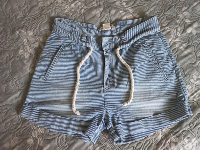 Шорти під морський стиль у вузеньку біло синю смужку для дівчинки на ріст 158-164. Довжина 33, пояс 35 , поб 46 см , у дуже хорошому стані.