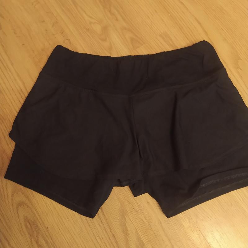 Черные шорты decathlon для девочки 10-12 лет. отделаны рюшкой. есть внутренний кармашек для ключа. пояс резинка ПОТ 34, ПОБ 48-50. глубина по переднему шву 23, по заднему 32.