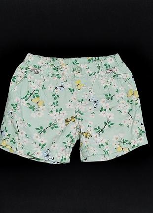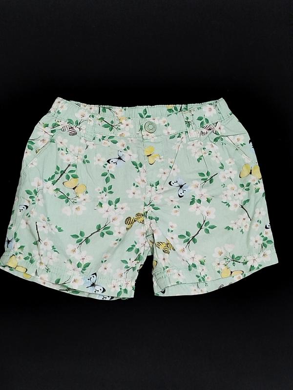 Лёгкие и классные шортики салатового цвета в отличном состоянии на ребёнка 3-4 года. Полуобхват по поясу регулируется внутренней резинкой на пуговице и максимально тянется до 29 см, высота посадки 17 см, длина по внутреннему шву штанины 8 см, длина по внешнему шву штанины 24 см. Ткань немного тянется. Модель 6814