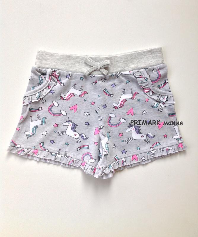 Primark Шорты с принтом "Единороги" В поясе эластичная резинка Шнурок и карманы - обманки Размеры: 98 см (2-3 года), 104 см (3-4 года), 110 см (4-5 лет) 100% хлопок В продаже есть маечка к комплекту Весь ассортимент детских шорт можно посмотреть здесь https://shafa.ua/uk/my/clothes?catalog=dlya-devochek%2Fshorty