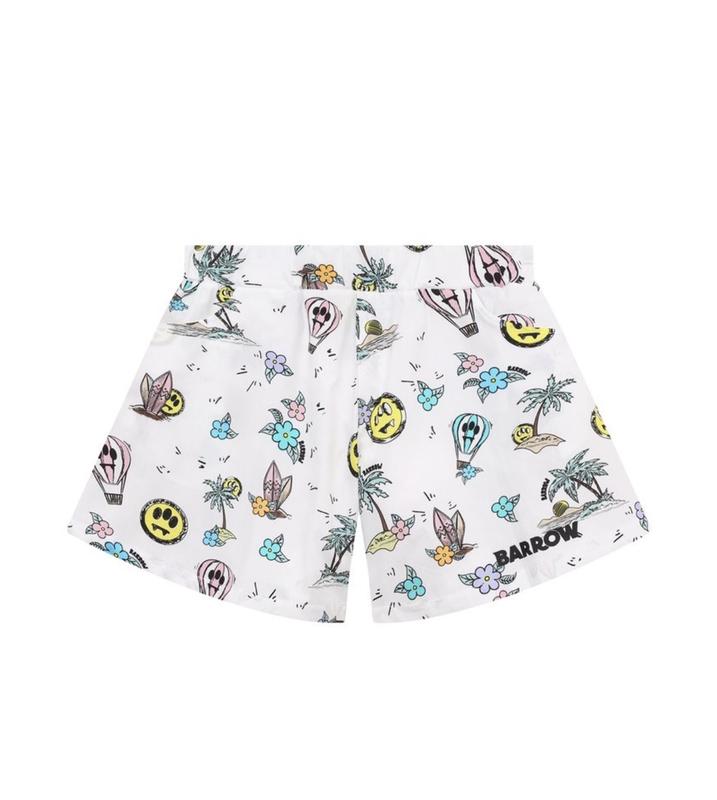 Новые можно раньше на резинке Белые шорты с эластичным поясом и двумя боковыми карманами сшиты из гладкого мягкого хлопка, хорошо пропускающего воздух, поэтому в изделии будет комфортно даже в жаркие дни. Тон свободной модели задает разноцветный тропический принт, дополненный символикой бренда.