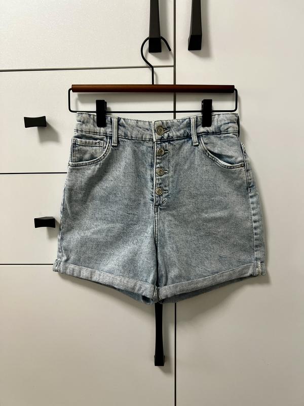 Джинсові шорти від H&M у відмінному стані. Розмір 152, 11-12років. В поясі є утяжка. Колір світло-блакитний(на фото виглядають сірішими) Трохи тягнуться. Довжина 35см Пояс 32см Стегна 44см