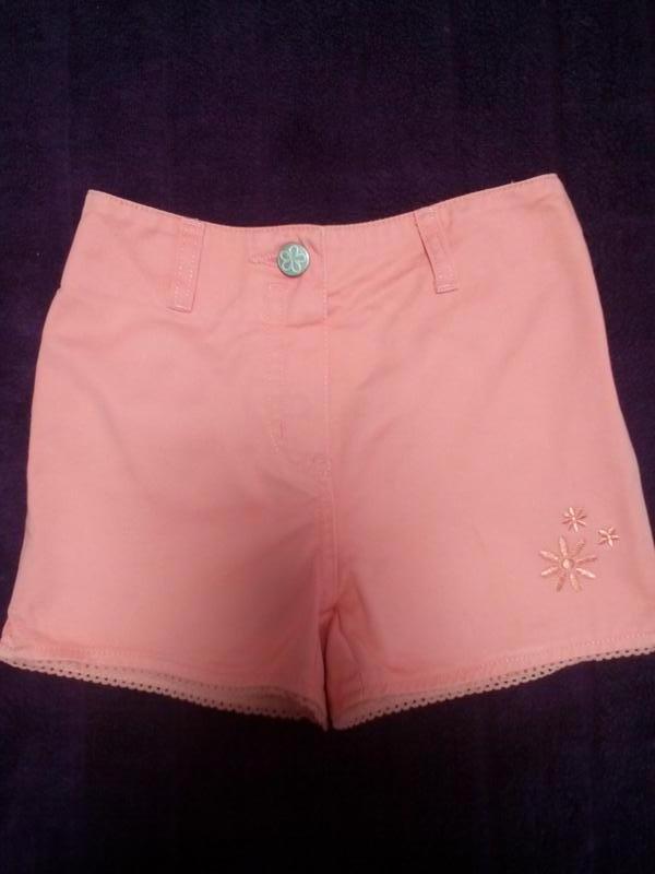 Шорты на 5 лет (110 см) в реальности цвет розово-оранжеватый (на фото немного искажен) одеты пару раз.состояние новых ПОТ 26 см ПОБ 31 см длина по внешнему шву 25 см