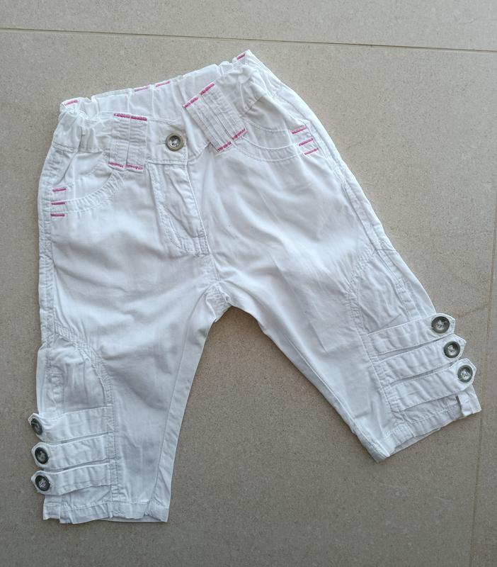 Капрі на розмір 92, тканина котон, колір білий. В поясі є резинка для утяжки. При потребі надам додаткові фото і заміри. Стан хороший, без дефектів.