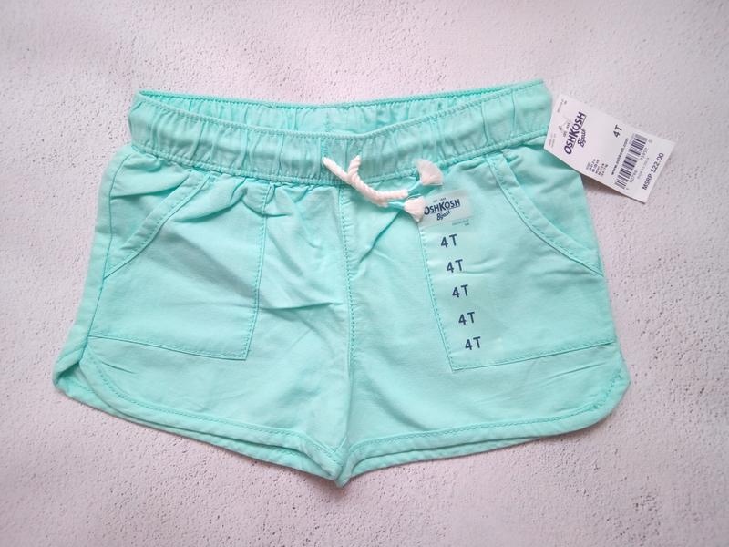Новые шорты OshKosh для девочки. 100% хлопок. Пояс на резинке, плюс дополнительно регулируется шнурком. Впереди боковые карманы. Цвет – бирюзовый. Размер: 8 лет. Замеры: ПОТ – 31 см, ПОБ- 41 см, длина – 25 см