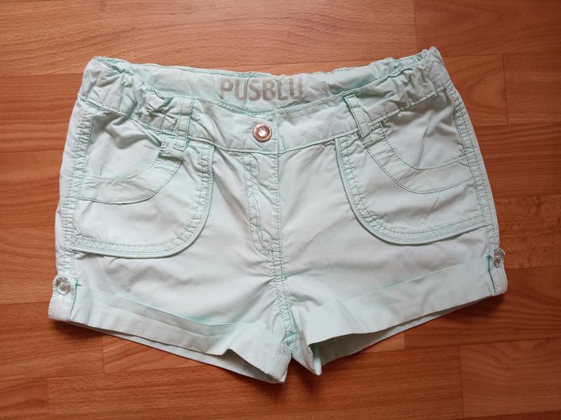 Продам шорты котоновые Pusblu р.134-140. Состояние в-общем отличное, только совсем слегка выгорел цвет (показала на фото в сравнении с тканью под подворотом). Цвет - бледно бирюзовый. Замеры: длина по боку 23 см, ПОТ 33 см (в поясе есть резинка-утяжка, можно регулировать), ПОБ 39 см, шаговый шов 4 см. Возврата нет!