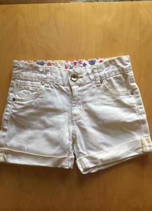 Белые джинсовые шортики ZARA KIDS,карманчики спереди и сзади,заклепки, сердечко для красоты,внутри резинка с пуговкой для регулировки размера,отвороты пришиты.На поясе шлицы д/ремешка,отсрочка желтой никой,яркие летние!!!