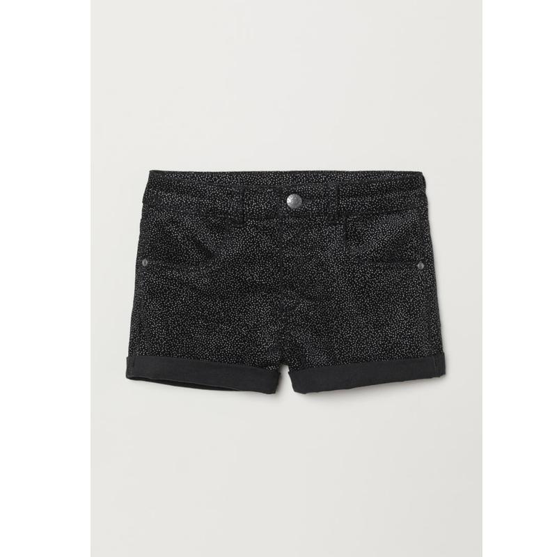 Шорти з вузькосмугового вельвету з блискучим принтом, пришитими вилогами знизу на штанинах, передніми і задніми кишенями. Застібка на блискавку і гудзика на талії.розмір 158см виміри напівобхват в см; піт-35см побіди-42см посадка-25см ззаду 29см крок шов-6,5 см довжина-27см ширина штанини зверху-25,5 см Увагу! стан новий, сток,бирки можуть бути зрізані або пошкоджені,це не секонд☝️