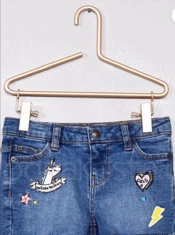 Красивые джинсовые шорты короткие для девочки с неотделаным низом,с разноцветными нашивками,на 10 лет,размер 136-143см,известного бренда Kiabi,на поясе есть стягивающие резинки.