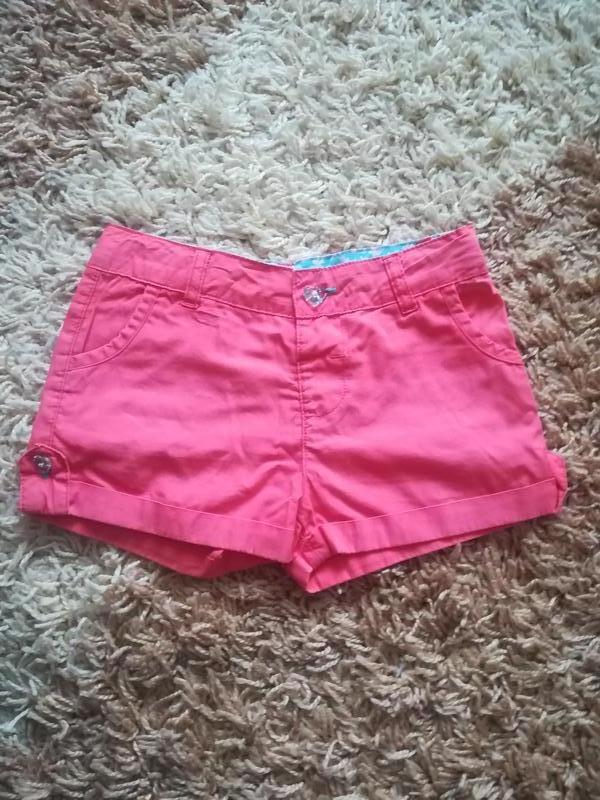 Красивые шорты кораллового цвета в отличном состоянии, карманы, пуговички сердечки, возраст указан 2-3 года, рост 98 см. Замеры: пояс 27см, есть утяжки, бедра 32,5см, длина 19,5 см, глубина посадки по переду 16 см , глубина посадки по заду 21,5 см