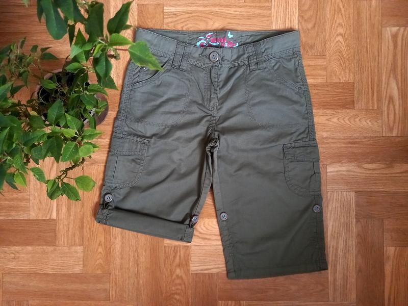 Модные качественные х/б шорты с подворотом от немецкого бренда review . Новые, без бумажных бирок. Цвет между зеленым и хаки(на фото зеленый оттенок передать не получилось). В пояс вставлена регулируемая резинка. Размер указан на рост 152, 12 лет. Ориентируйтесь на замеры: ПОТ 36,5 ПОБ 43 посадка перед/зад - 20/28 шаговый 31 ширина штанины у бедра 25,5 ширина штанины по низу 21.