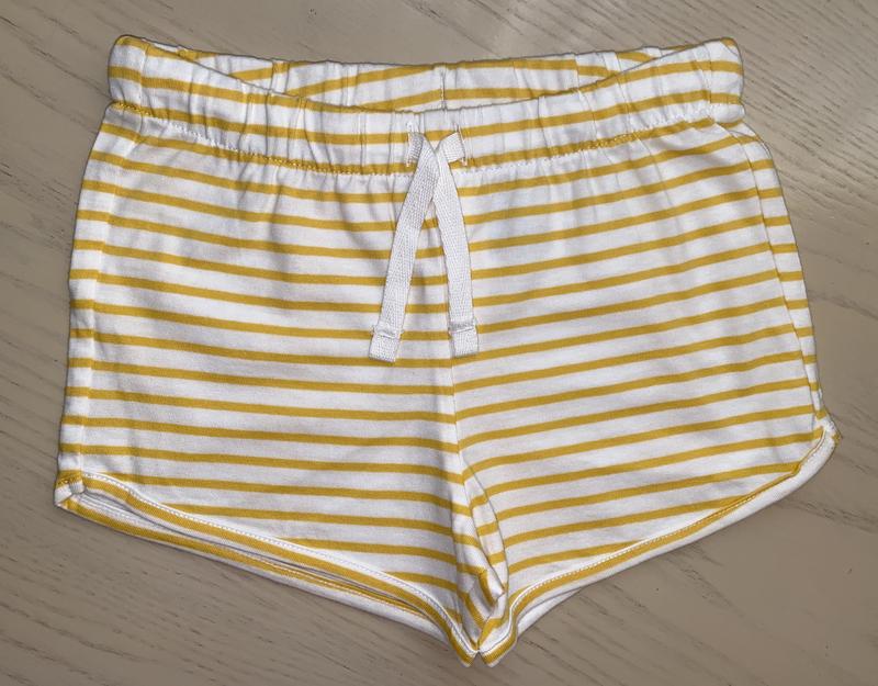 Трикотажные шортики H&M (Германия) Отличное качество по отличной цене! Шорты из мягкого хлопкового трикотажа с резинкой и кулиской на талии. Скругленный низ. Цвет: бело-желтая полоска. Состав: 100% хлопок. Размеры в наличии: 104 Цена окончательная!