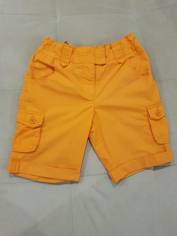 Гарні літні шорти на дівчинку на зріст 134 см ярко- помаранчевого кольору. Є 6 кишеньок. Купувала доньці в Німеччині. Продаю, бо замалі. Довжина сортів 40 см, ПОТ 29 см+ще тягнеться резинка трошки ( в середині є резиночка з гудзиками для підтяжки), ПОБ 39 см. Склад 65% polyester, 35% cotton.